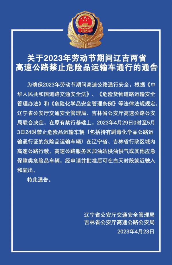 为保证2023年劳动节期间高速公路通行安全,依据《中华人民共和国路途交互与通行安全法》、《风险货品路途运送安全管理办法》和《风险化学品安全管理条例》等法令和法规规则,辽宁省公安厅交通安全管理局、吉林省公安厅高速公路公安局联合决议,在原有禁行根底上,2023年4月29日0时至5月3日24时制止风险品运送车辆 (包括持有剧毒化学品公路运送通行证的风险品运送车辆)在辽宁省、吉林省行政区域内高速公路行进。高速公路服务区加油站供油供气或其他应急保证类风险品车辆,经请求并同意后可在白日时段就近驶入和驶出。