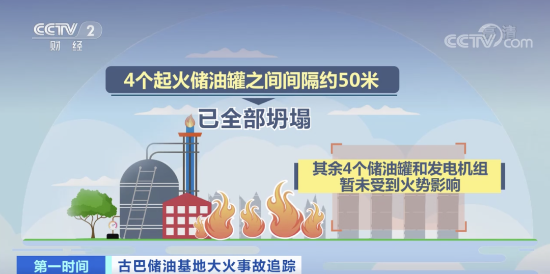 据了解,这4个起火储油罐之间距离约50米。此前,古巴消防局官员亚历山大·阿瓦洛曾表明,4个着火的储油罐已悉数崩塌,但其他4个储油罐和发电机组暂未受到火势影响。